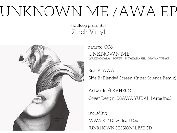 A 面収録の「AWA」は、やけのはら、P-RUFF、H. TAKAHASHI、3 名の共作として制作された、浮遊感を帯びた上音に疾走感のあるビートが融和したアンビエント・ハウス。光の差し込む海中を連想させる音像に、聴く者の気持ちを遠くの地へ連れ去るようなマジカルなリズムが重なる、UNKNOWN ME の新境地を感じさせる美しいダンス・トラックとなっている。